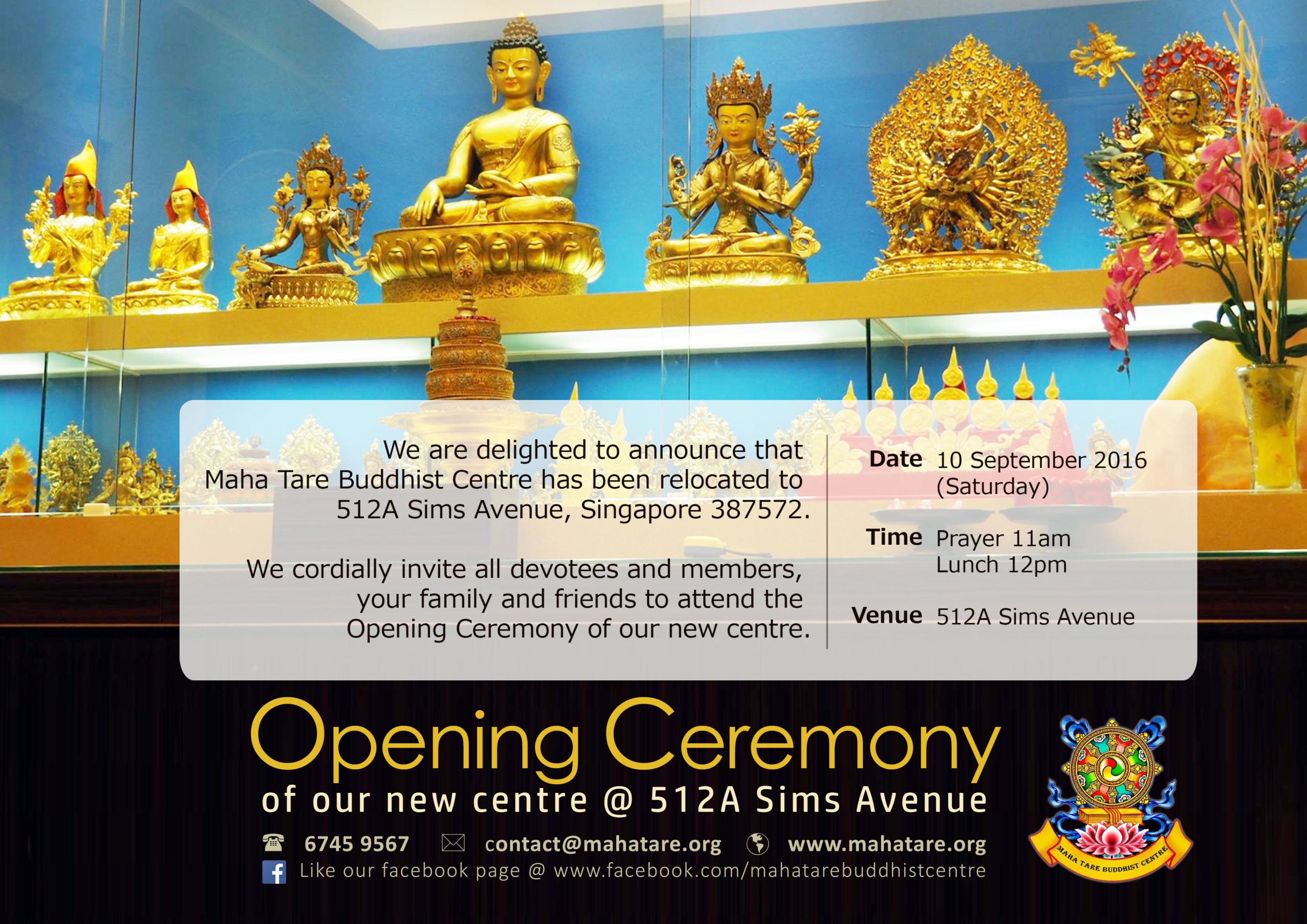 Maha Tare Buddhist Centre sincerely invites all of you to our opening ceremony on 10 September 2016, 11am. Your presence will greatly grace our ceremony. With a new, bigger place, the Centre hopes to be able to reach out and spread Buddha Dharma to more people and help more people. The Centre and Geshe Lama Konchok would also like to give our appreciation to our committee, volunteers, helpers and supporters. Without your help and support, the Centre would not be able to grow and reach out to the bigger community. Please do come to the opening ceremony so we can also give thanks to you personally. See you all on 10 September, 11am!